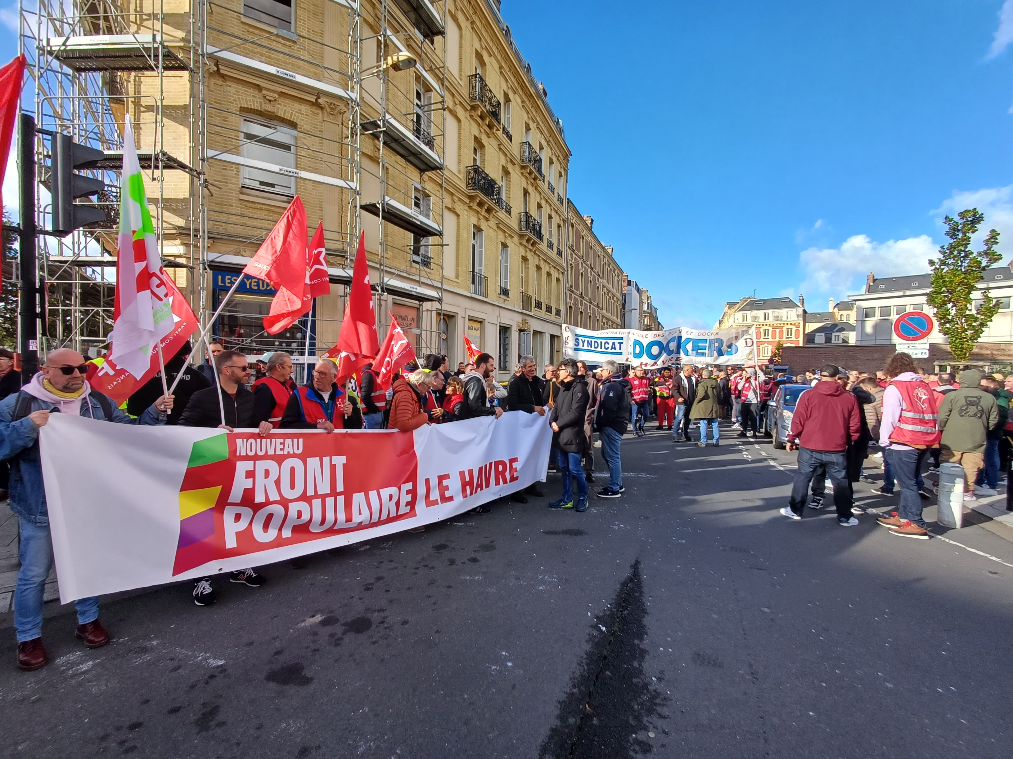 La Fédération nationale des Ports et Docks CGT a appelé à quatre heures de grève le 1er octobre 2024. Les dockers étaient massivement présent à la manifestation unitaire au Havre. <br />